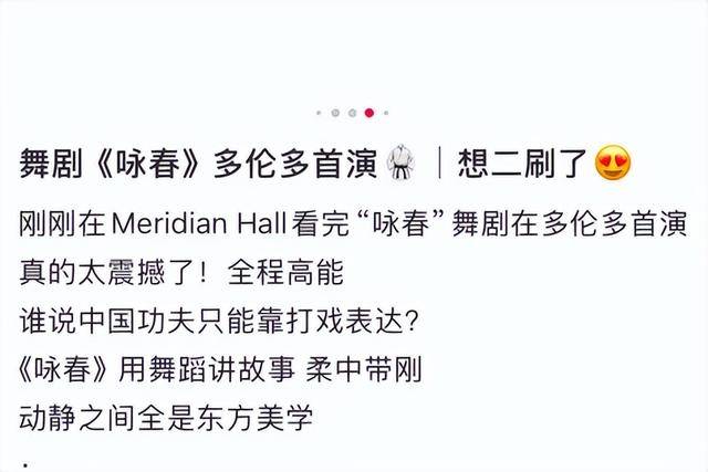 ron观后感伤:“《咏春》的编舞别出机杼加拿大资深跳舞评论员Paula Cit,耽溺令人,丰裕多彩整场表演。“涌现了你们中国人常说的‘妇女能顶半边天’”她稀少称道了剧中对女性脚色的充溢表示:。”